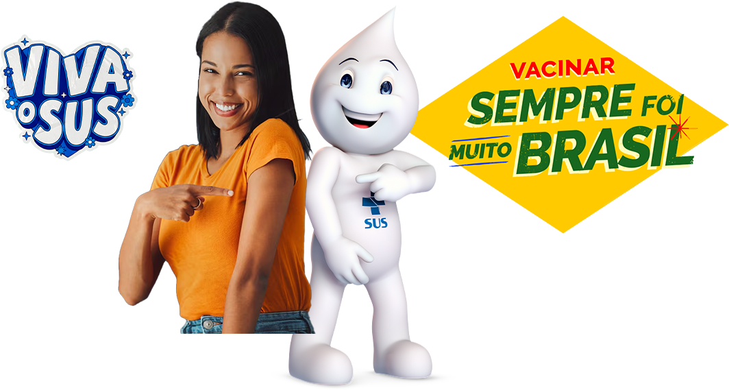 Zé Gotinha e uma moça estão mostrando o braço dando alusão de apoio a vacinação.